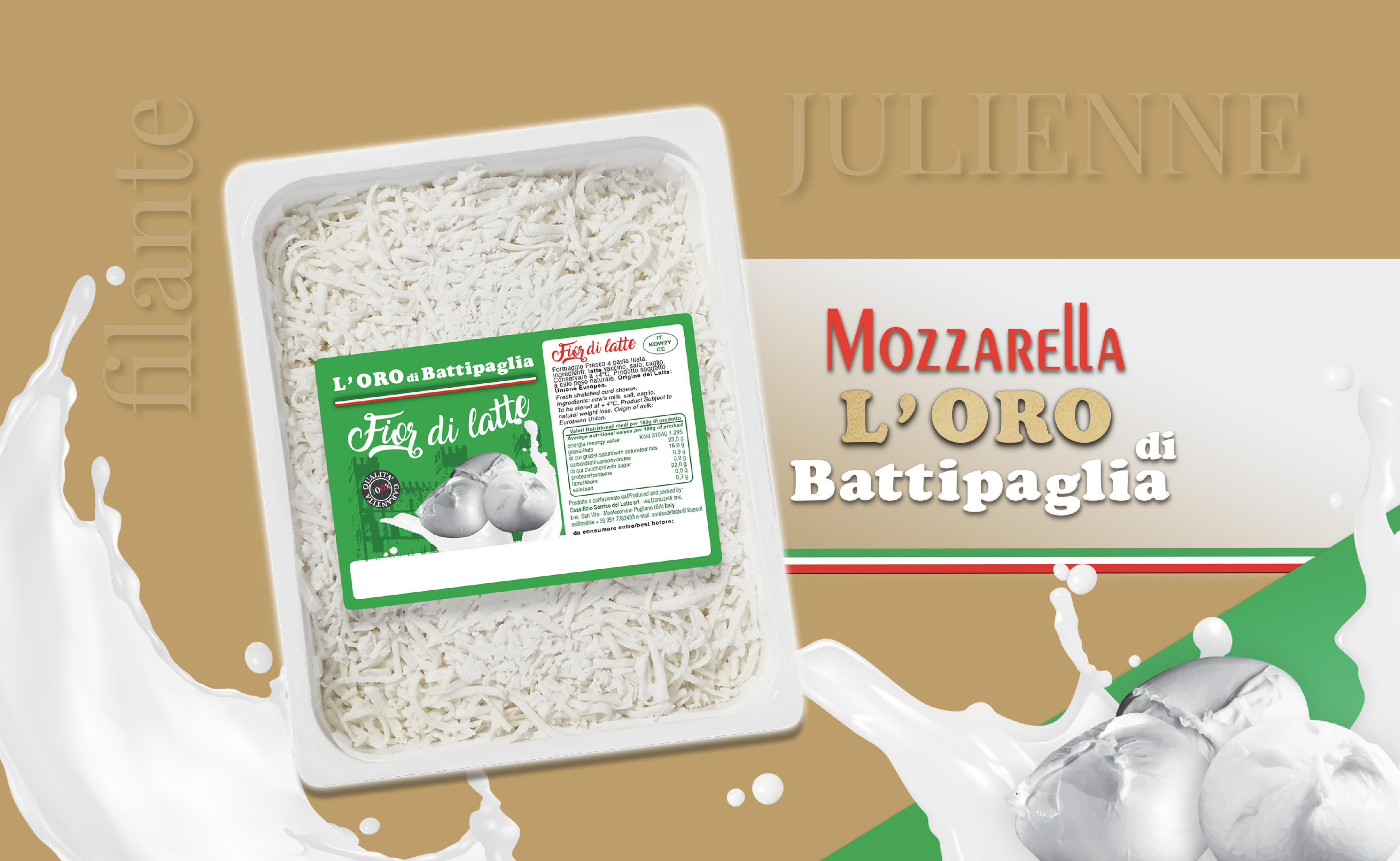 La mozzarella Fior di Latte rappresenta uno dei nostri gioielli culinari, rinomato per la sua ricchezza di proprietà e sapore, un piacere per tutti i palati! La Julienne de L'Oro di Battipaglia è il compagno ideale per pizzaioli e chef, offrendo un'esperienza
